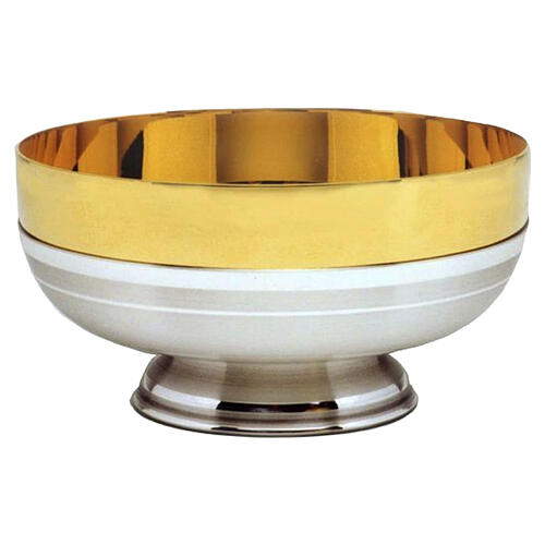 Made by an Italian firm specialised in the production of liturgical metalware, this paten is crafted in silver‑plated brass with a gold‑plated interior, suitable for the reservation of hosts during the celebration. The base is defined by a satin‑finished undercup that supports the main cup; the cup is enriched by a decorative band in smooth silver‑plated brass while the upper rim is finished in smooth gold‑plated brass, creating a subtle contrast between the surfaces.