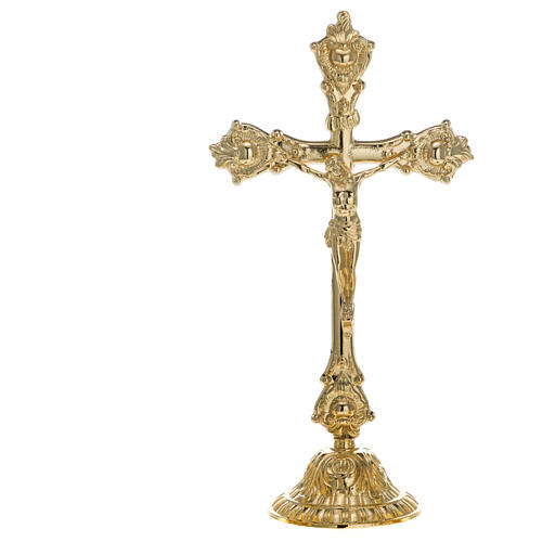 This altar cross is made of gold plated brass, matching the same decorative style of the coordinated candlestick with code AR000330.