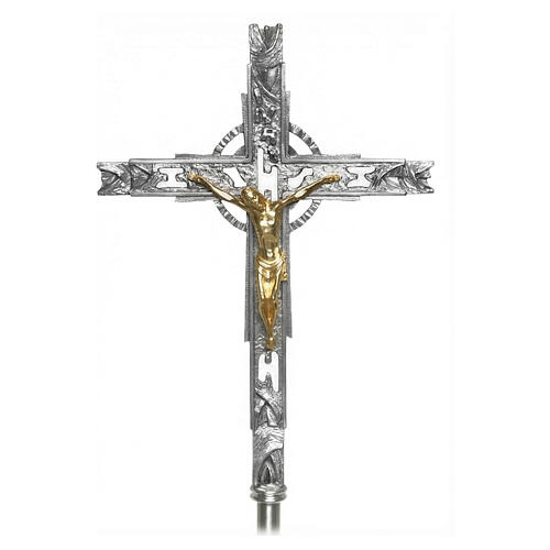 Processional cross in brass with a silver finish and a gilt metal Christ applied to the front.