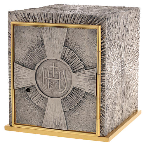 The exterior presents a silver finish over a gold-toned base; the door is framed by a gilded border that highlights the central JHS symbol, rendered as a radial cross on a worked background.
