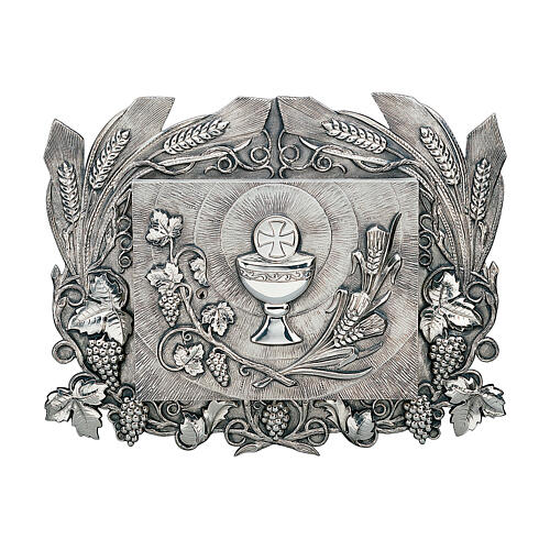 Built-in tabernacle by Molina, Eucharistic chalice, grapes and wheat halo, 16x18 in, gold plated brass