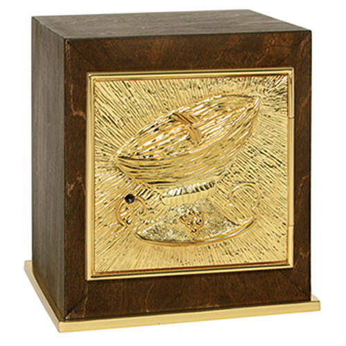 This tabernacle combines a mahogany wooden body with a gilded brass base and door, designed for use on the Eucharistic altar. The front door is decorated with a chalice and a bread basket, Eucharistic symbols that link the wine to the Body of Christ. The interior is illuminated and internal dimensions are 6.1x6.1 in with gilded brass inner panels.