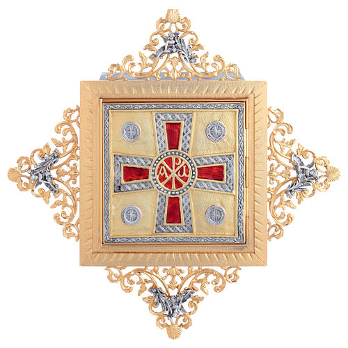 Wall tabernacle in brass with cross image, Chi-Rho, Alpha and Omega.