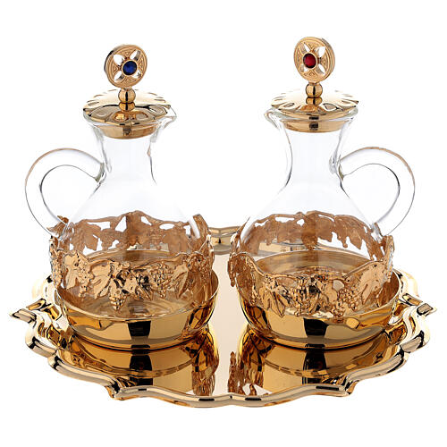 Palermo cruets, 24K gold plated brass. Liturgic cruets Palermo, made of glass and 24K gold plated brass, with flower-shaped tray.