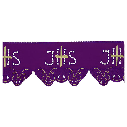 Cutwork frill for altar cloth, purple and gold, h 7.5 in. Purple altar cloth trim with a golden embossed embroidery of a cross over a cutwork IHS monogram, made in Poland by a small tailoring workshop.