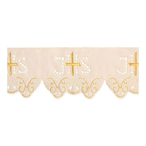 Ivory-coloured trim for altar cloth with golden cross and cutwork IHS, h 7.5 in