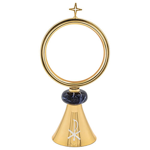 Monstrance in golden metal, distinguished at the base by the engraved and silvered inscription Chi-Rho, a symbol of peace and sacredness. The central node is embellished with a blue sodalite stone, adding a touch of understated elegance.