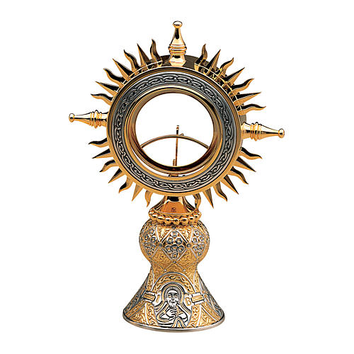 Molina ostensory in Baroque style Tassilo in two tone. Ostensory similar to the Tassilo chalice, made by the Spanish company Molina. This ostensory and paten are part of the Romanesque collection of Molina. The Romanesque art represents the spiritual union of Europe and in that moment the concept of Christianity was born. The Occidental culture blooms and the supremacy of the European culture will impose itself and develop. New constructive techniques will appear and the expression and beauty will be put together in the figurative arts. All the Romanesque pieces of this collection are developed by Spanish goldsmiths to exalt the beauty and character of this classic style and to combine elegance, balance and handicraft.