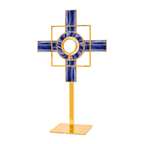 This monstrance combines square and circular geometric shapes, crafted in refined gold plated brass, with blue enamel decorations that create the illusion of rays running along the arms of the cross through light and dark contrasts.
