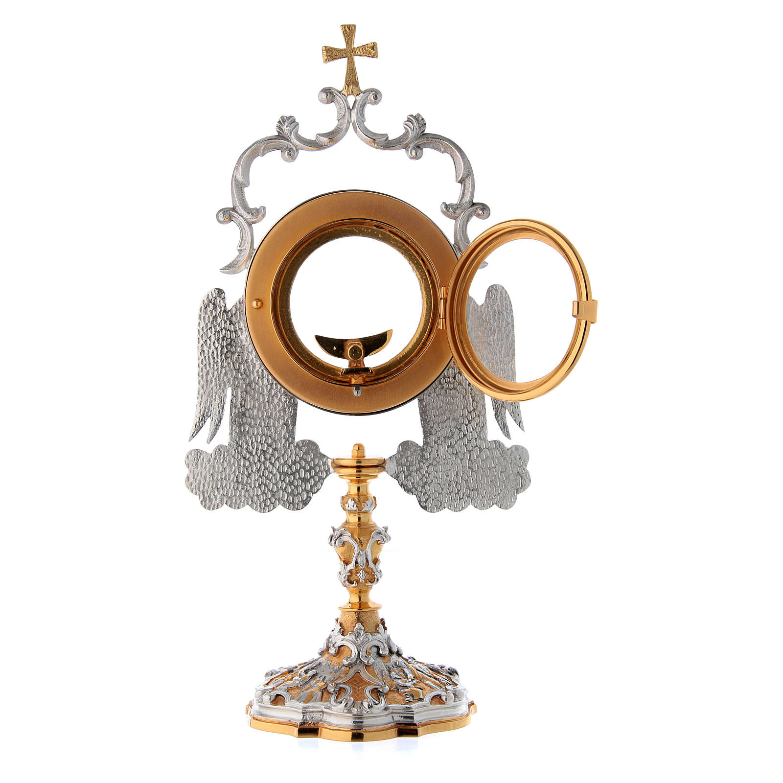 Silver and gold plated bronze monstrance finely decorated with two paying angels and red stones around the Blessed Sacrament glass cylinder.