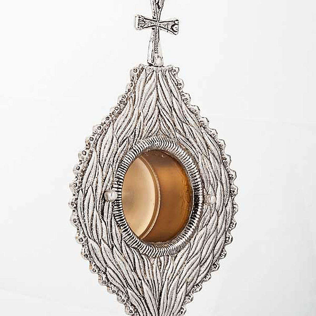 Reliquary. Shrine decorated with leafs framing the glass box like flames raising towards the cross. The reliquary is artisanally produced by a consolidated Italian company with a history in liturgical design. The original drawings and hand processing make each item a unique product.