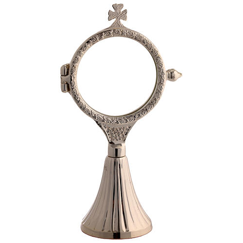 Monstrance for hosts up to 2.55-inch in diameter, with a circular case adorned with small embossed grape clusters on a tapered base.
