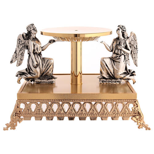 Measuring 15.1-inch in length and 11.6-inch in depth, the base is designed to support a monstrance on a 10-inch diameter platform, surrounded by two majestic angels measuring another 8.7 in, supporting the structure with their hands. The base's craftsmanship features floral details and piercings that define the Baroque style, making it not just a base for a monstrance but also a piece of art. This base becomes a visually striking and spiritually significant element.