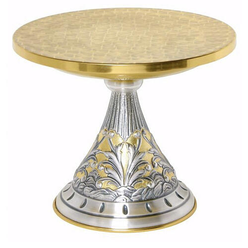This stand for the monstrance is crafted in brass and copper, enriched by meticulous chiselling that depicts traditional liturgical motifs. With a height of 9.1 in and a 11.-inch top plate, it offers a stable and proportioned support for the monstrance during Eucharistic adoration.