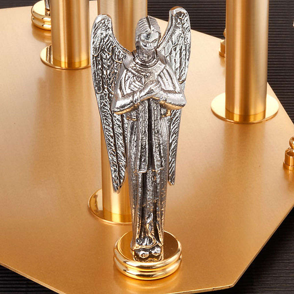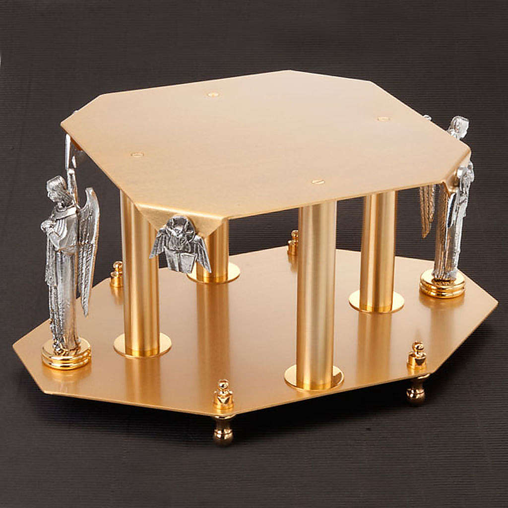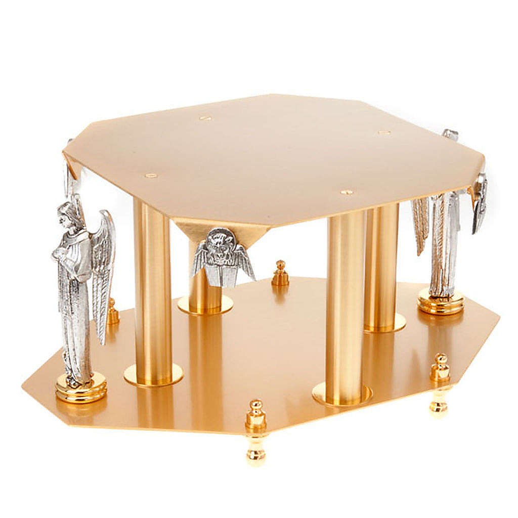 Monstrance stand in golden and silver brass. The thabor reproduces angels and the synmbol of the evangelists. The top plate measures 24cm while the base measures 36cm. This special thabor has been entirely hand-crafted in Italy by a small artisanal company, therefore every single piece is unique and unrepetable.