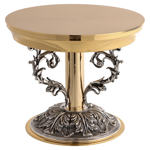 Liturgical brass monstrance stand with gold and silver finish and embossed detailing.