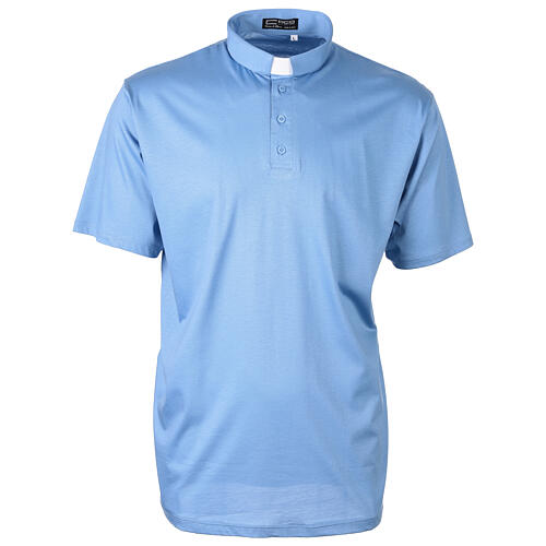 This elegant short-sleeve clergy polo is dyed in a refined aquamarine and features a clergy collar with three tone-on-tone buttons for a coordinated, sophisticated appearance.