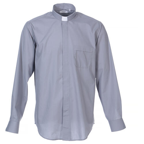 Long-sleeved light grey In Primis shirt with Clergy collar, made from a cotton-blend fabric: 65% polyester, 35% cotton (110 g/m²). The fabric is soft and breathable, easy to wash and iron.