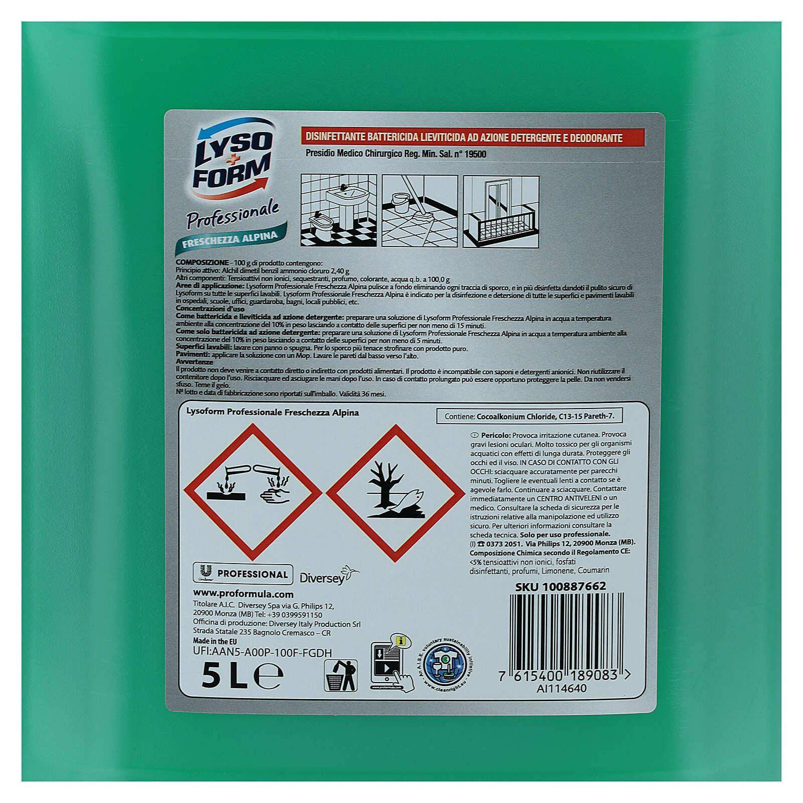 Disinfectant detergent: cleans and sanitises in depth, without damaging surfaces or metals. Eliminates unpleasant odours, leaving a delicate scent. Active even with low dosages.