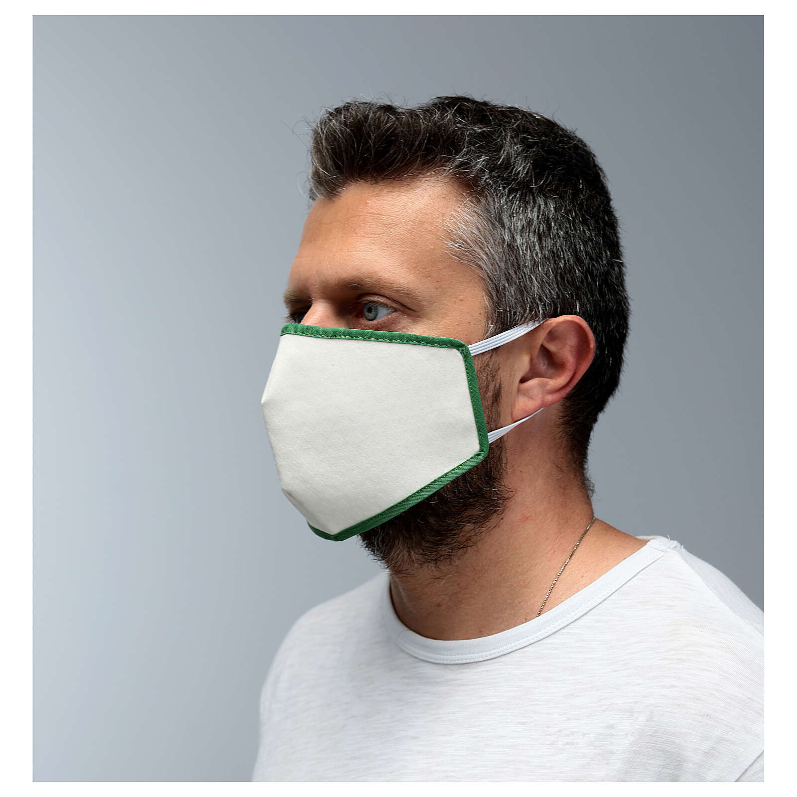 Fabric reusable face mask with green edge. Reusable mask made of ivory fabric of 100% bamboo fiber on the inside and 100% polyester on the outside.