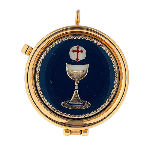 Host case with a golden decorative plaque with a height of 3 cm and a diameter of 5.3 cm.