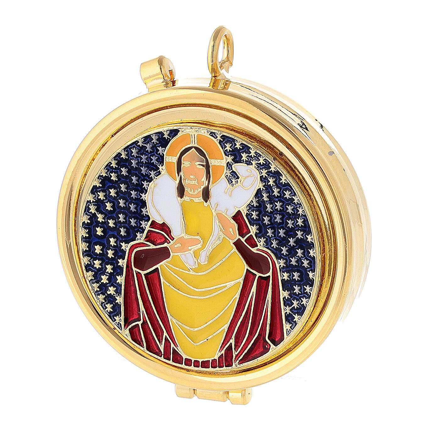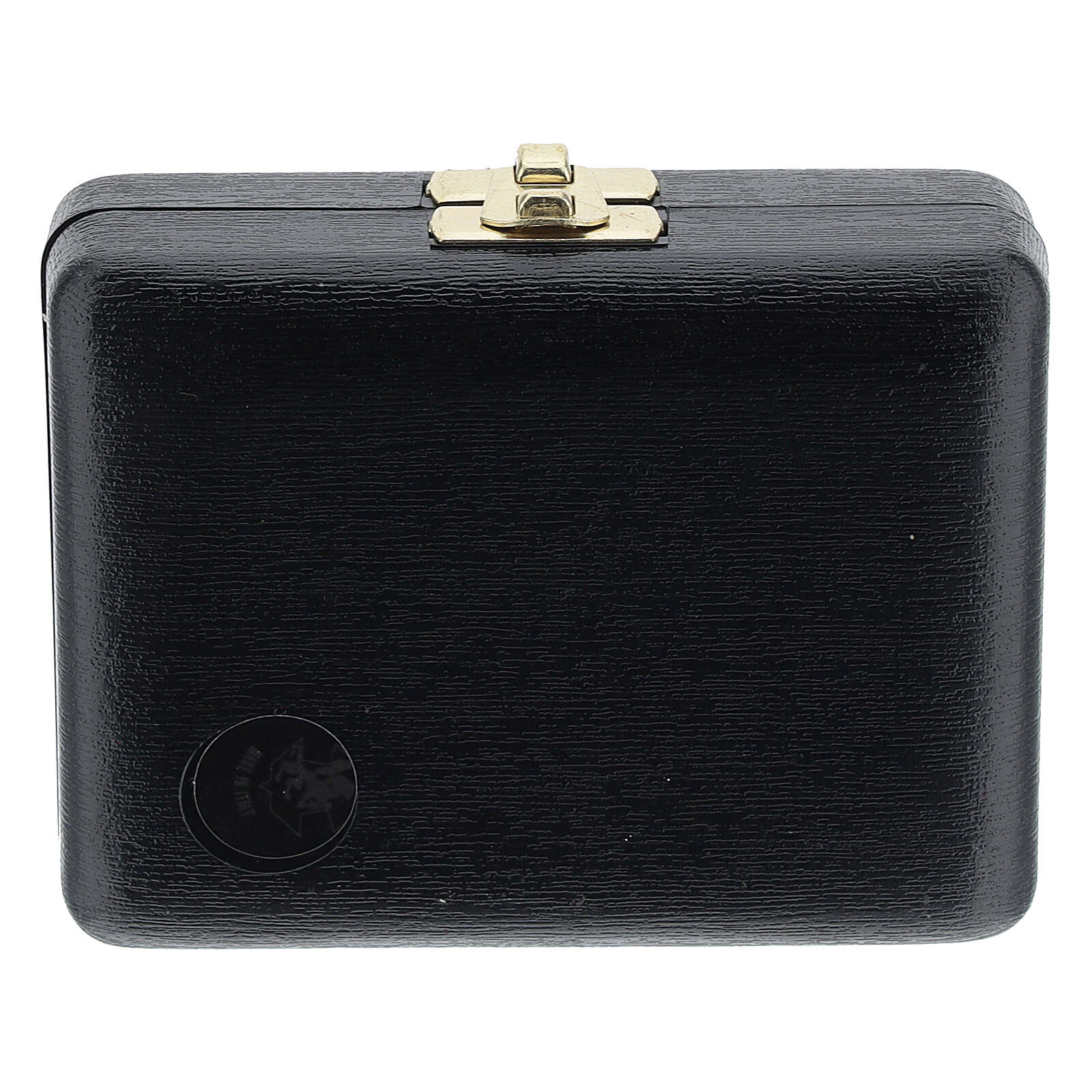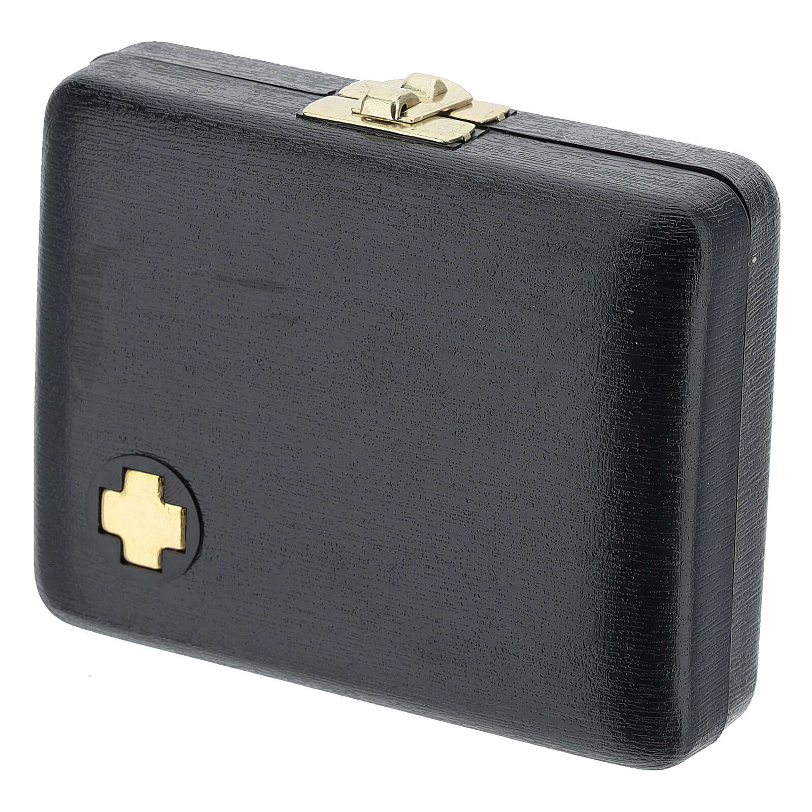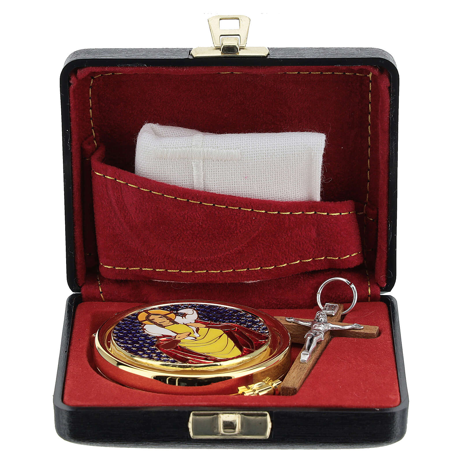 Pyx case with pyx, cross and towel. This rigid case in black fabric has an interior covered with a red lining. The case contains a metal pyx with good shepherd, a small cross, and a finger towel.