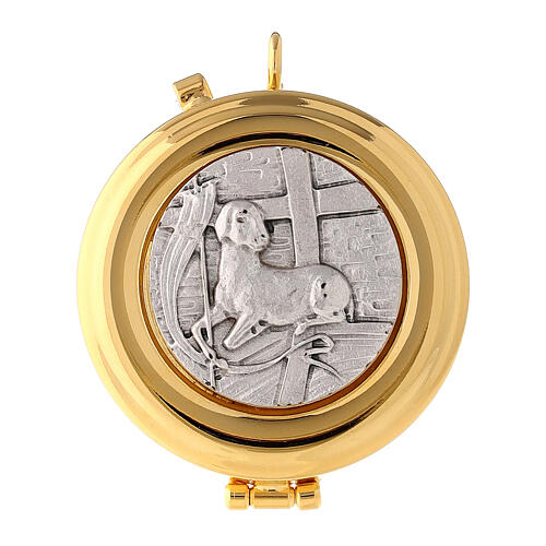 Pyx with lamb and cross, pewter, 2 in diameter. Eucharistic shrine made by hand in Italy of pewter and decorated with an image of the Lamb of God.