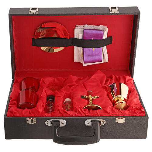 The set comprises a travel chalice, paten, Eucharistic pyx, water and wine cruets, table cross with two red glass candles, a stole, and altar linens.