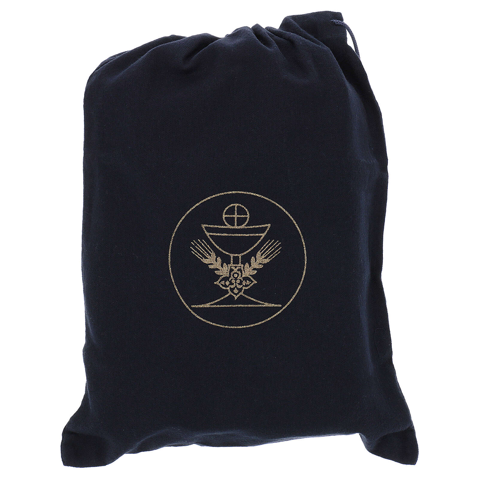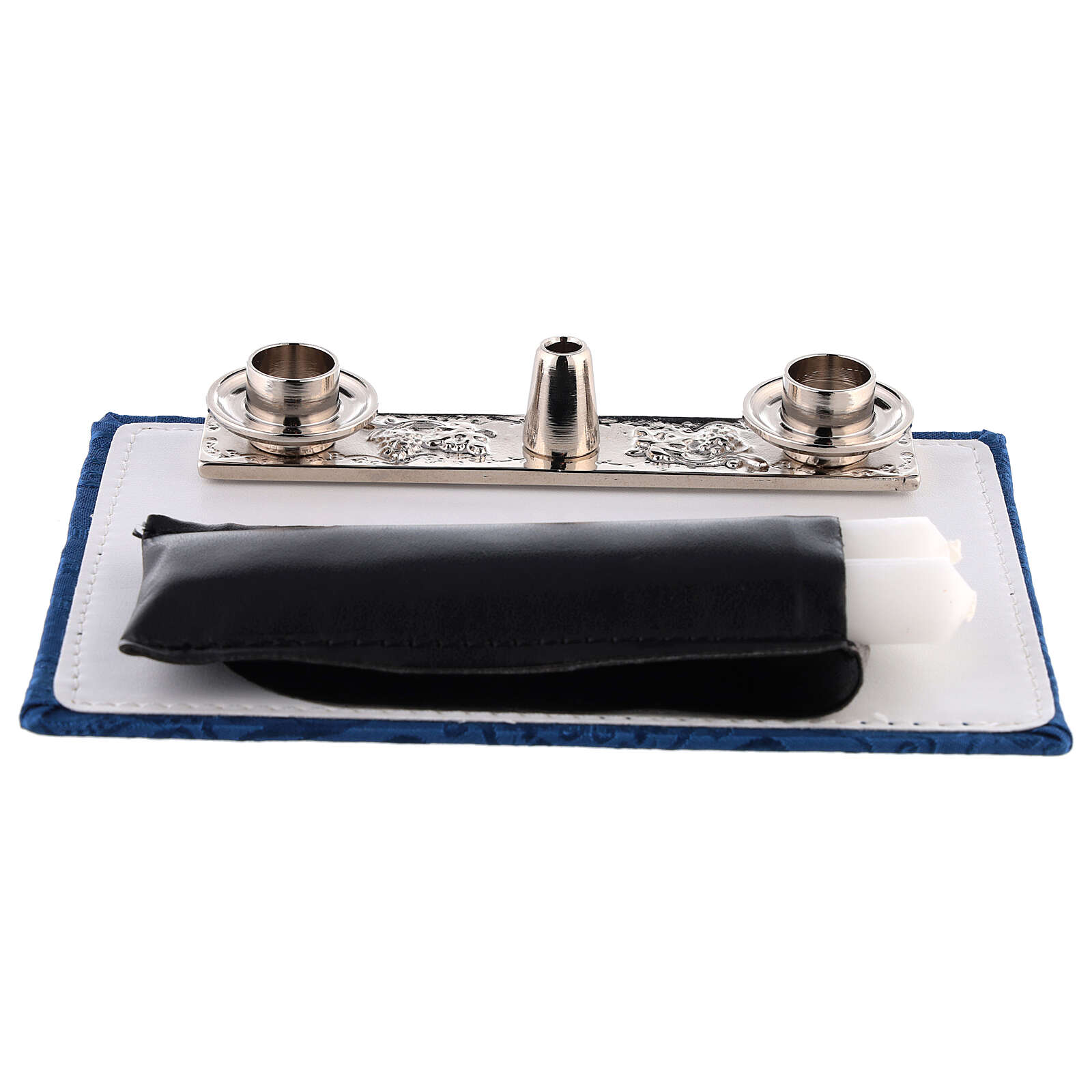 Mass kit with bag in leather, lined with blue jacquard fabric. It includes: sprinkler, 24K golden brass chalice with hammered base, plate, 30 ml bottles for water and wine, pyx in golden brass with IHS symbol, altar support for candles and cross, pastoral cross, wax candles, set of embroidered purificators and a reversible stole.