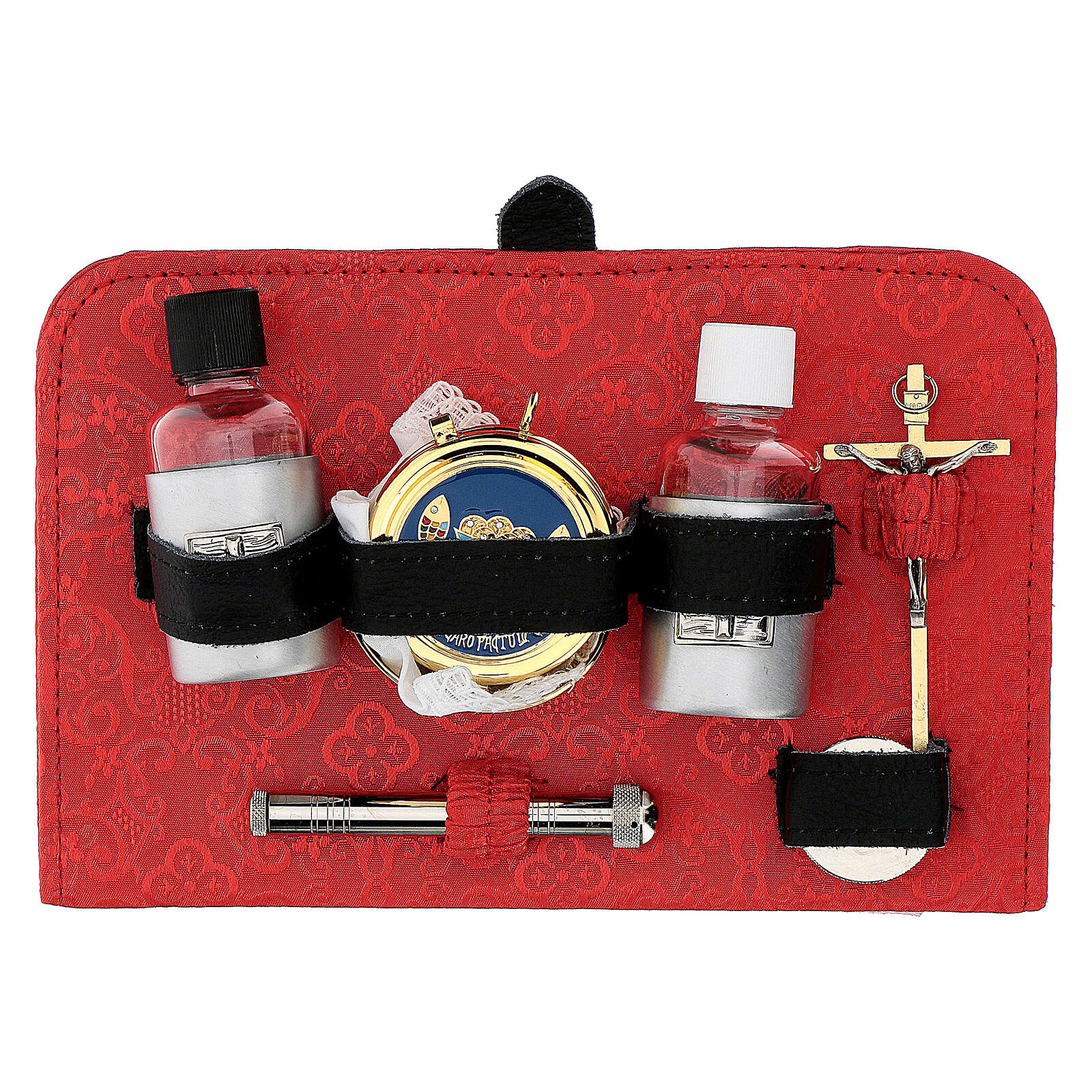 Mass kit with bum bag in waterproof fabric, lined with red jacquard fabric, containing a panel which holds the items. It includes: sprinkler, 24K golden brass chalice also usable as ciborium, plate with host support, 30 ml bottles for water and wine, pyx in golden brass with IHS symbol, altar support for candles and cross, pastoral cross, wax candles, set of embroidered altar linens and a reversible stole.
