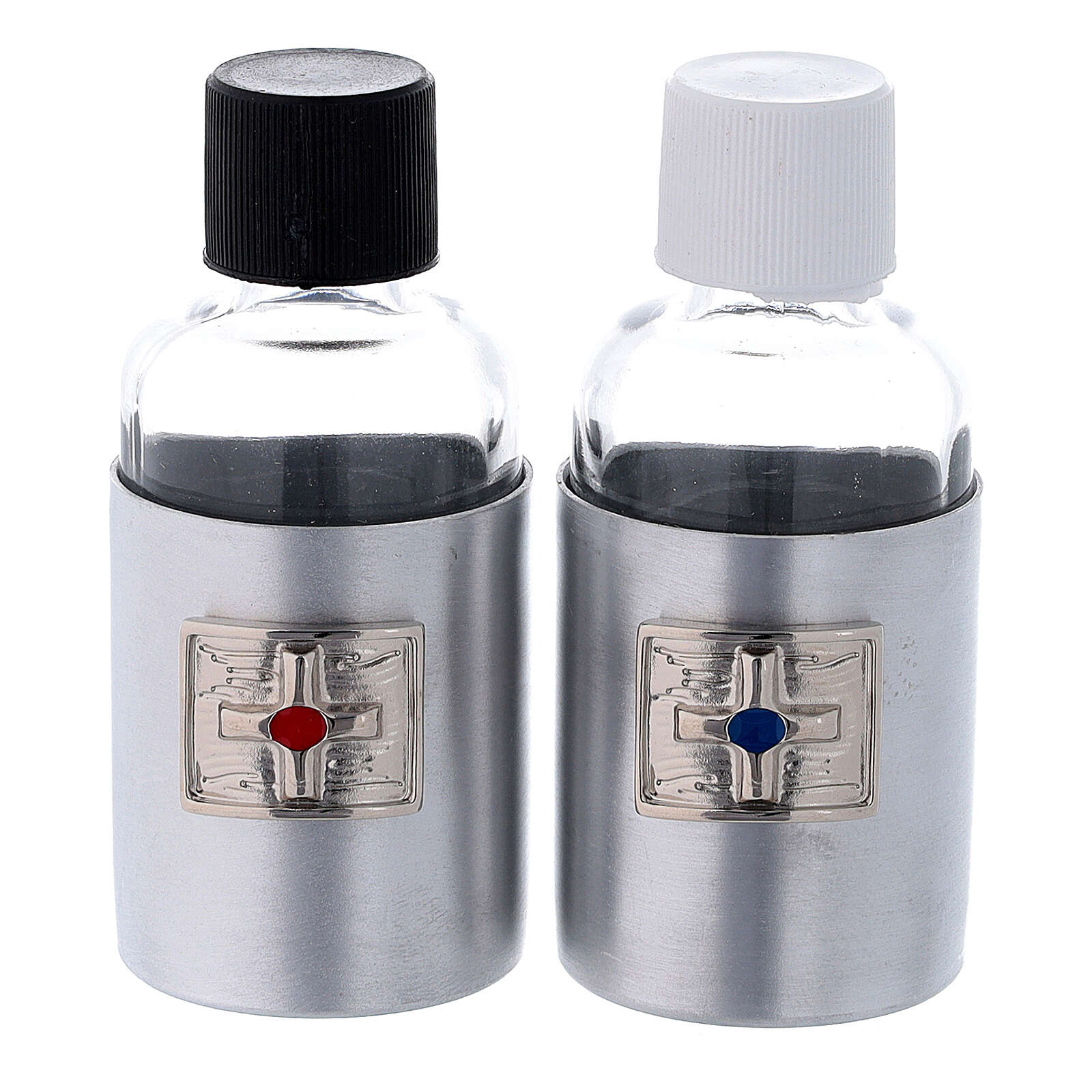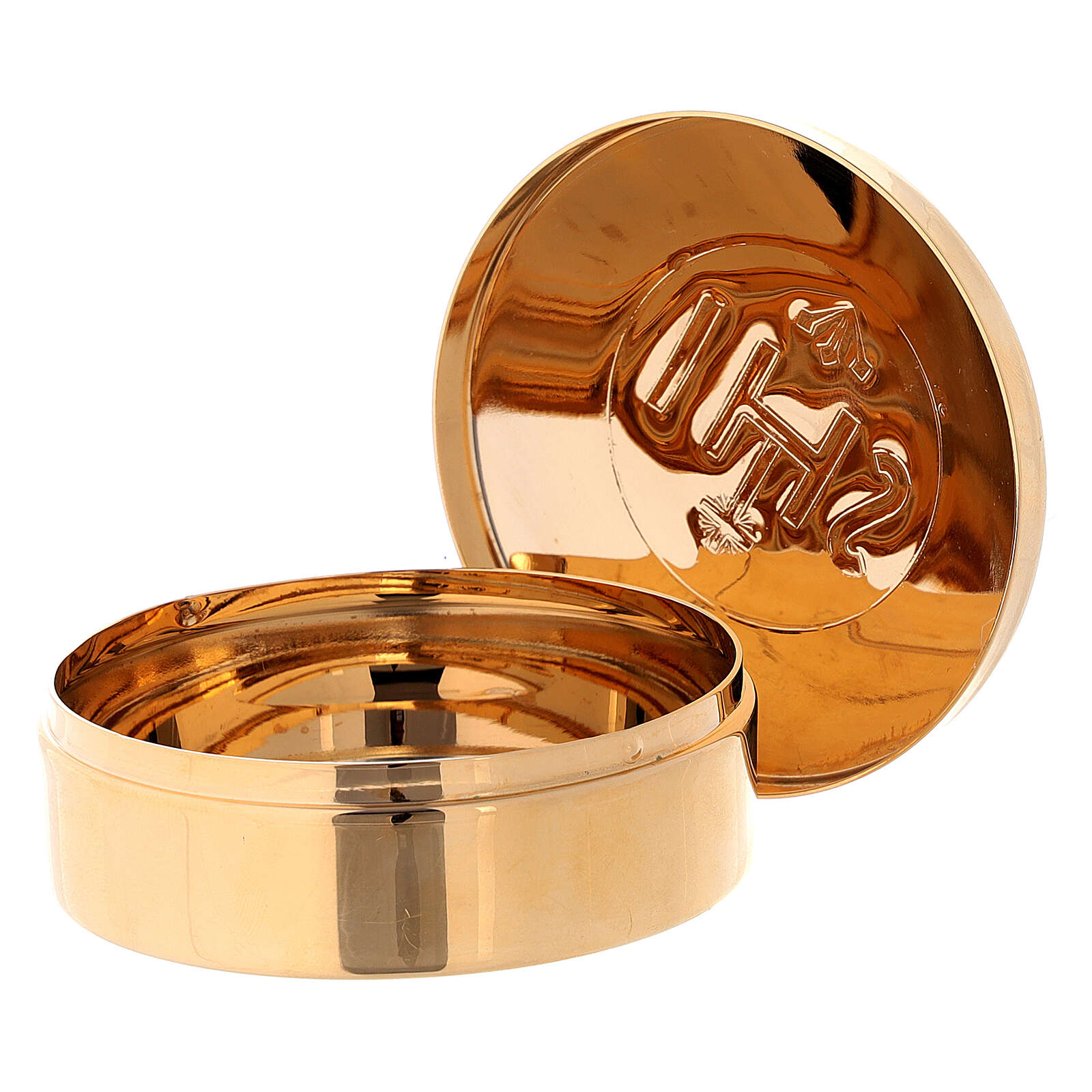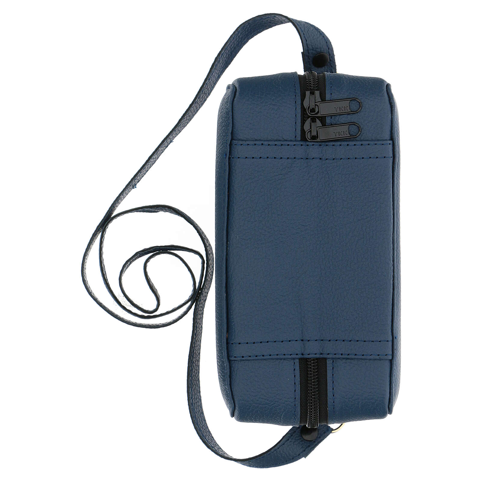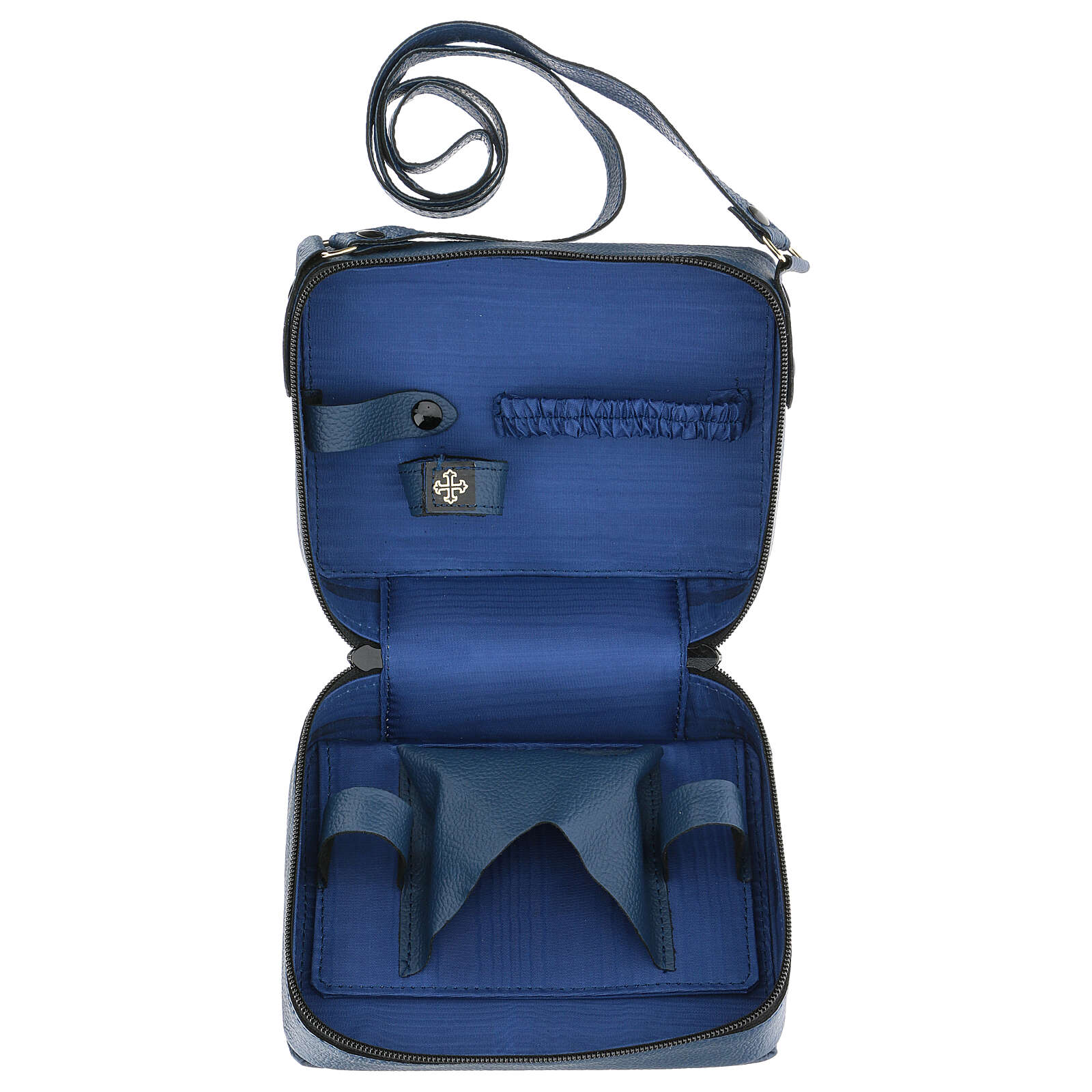 Mass kit coming in a leather bag with shoulder strap, lined with blue moire fabric. It contains: hammered 24K golden brass chalice, plate, pyx with IHS symbol, fused altar with candle and cross supports, 30 ml bottles for water and wine, pastoral cross, wax candles, reversible stole and altar linens with embroidered cross.