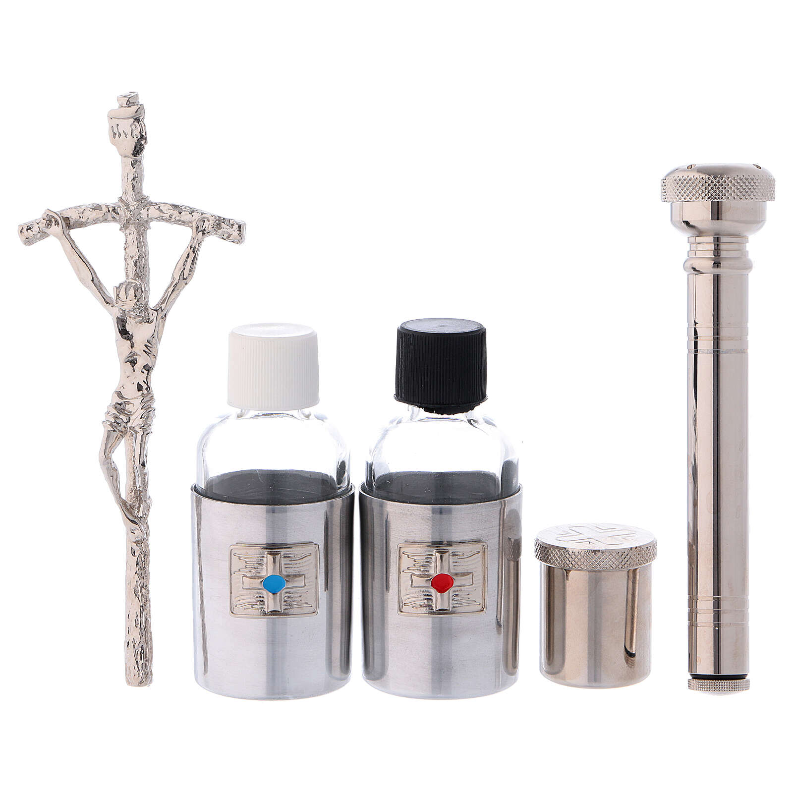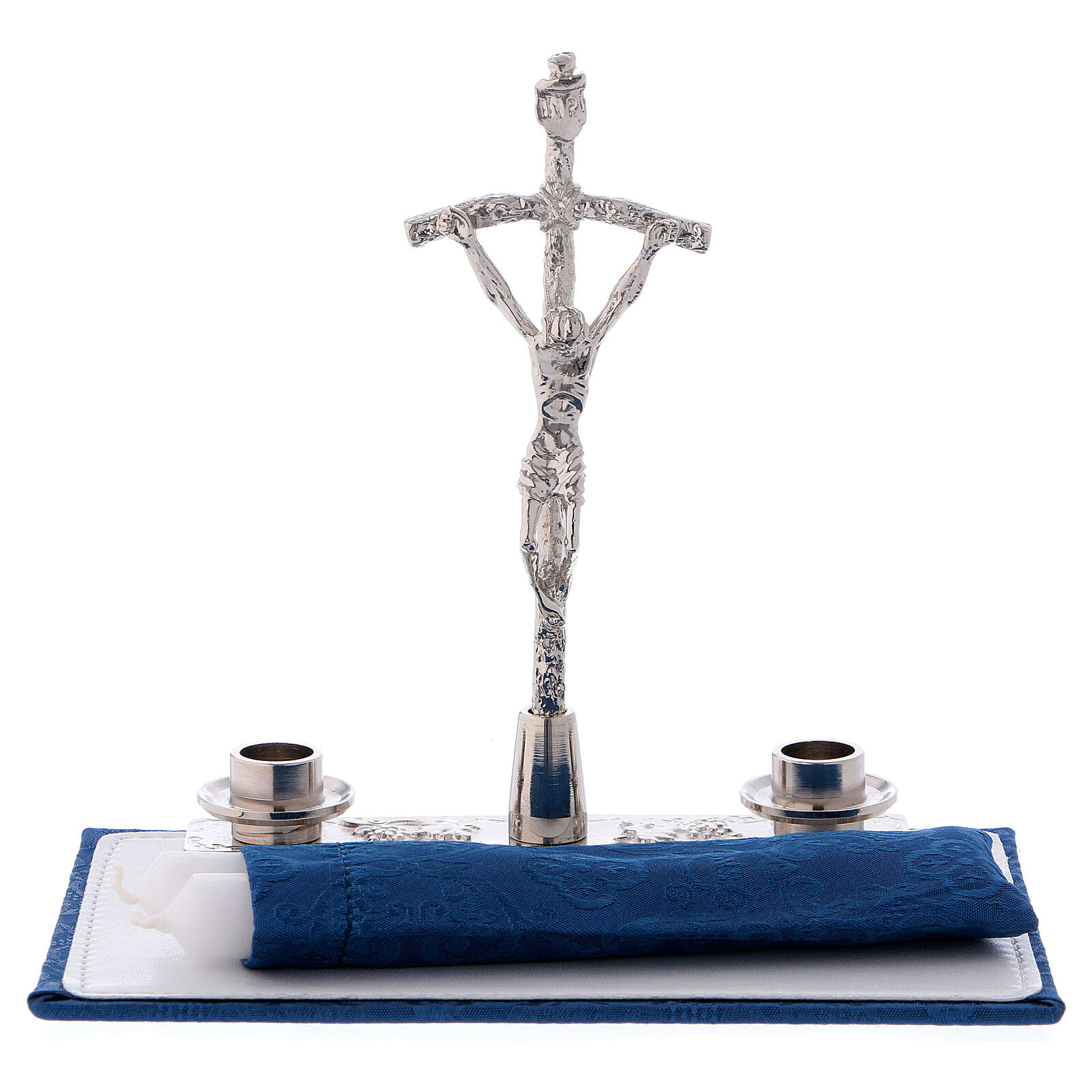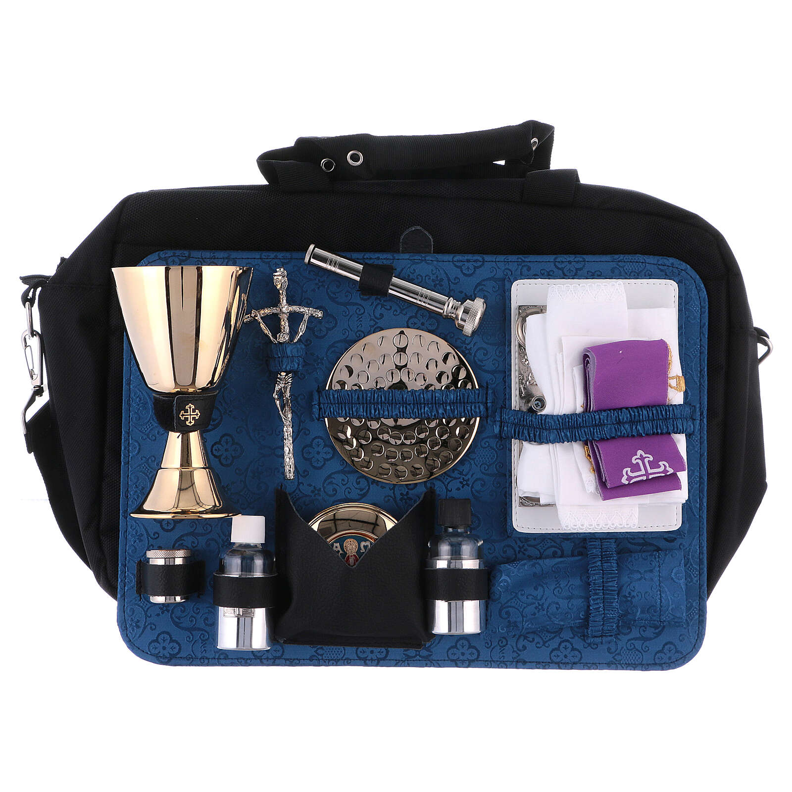 Mass kit coming in a technical fabric computer bag with many inside and outside pockets, containing a removable board, lined with blue satin, which holds the items. The Mass set includes: