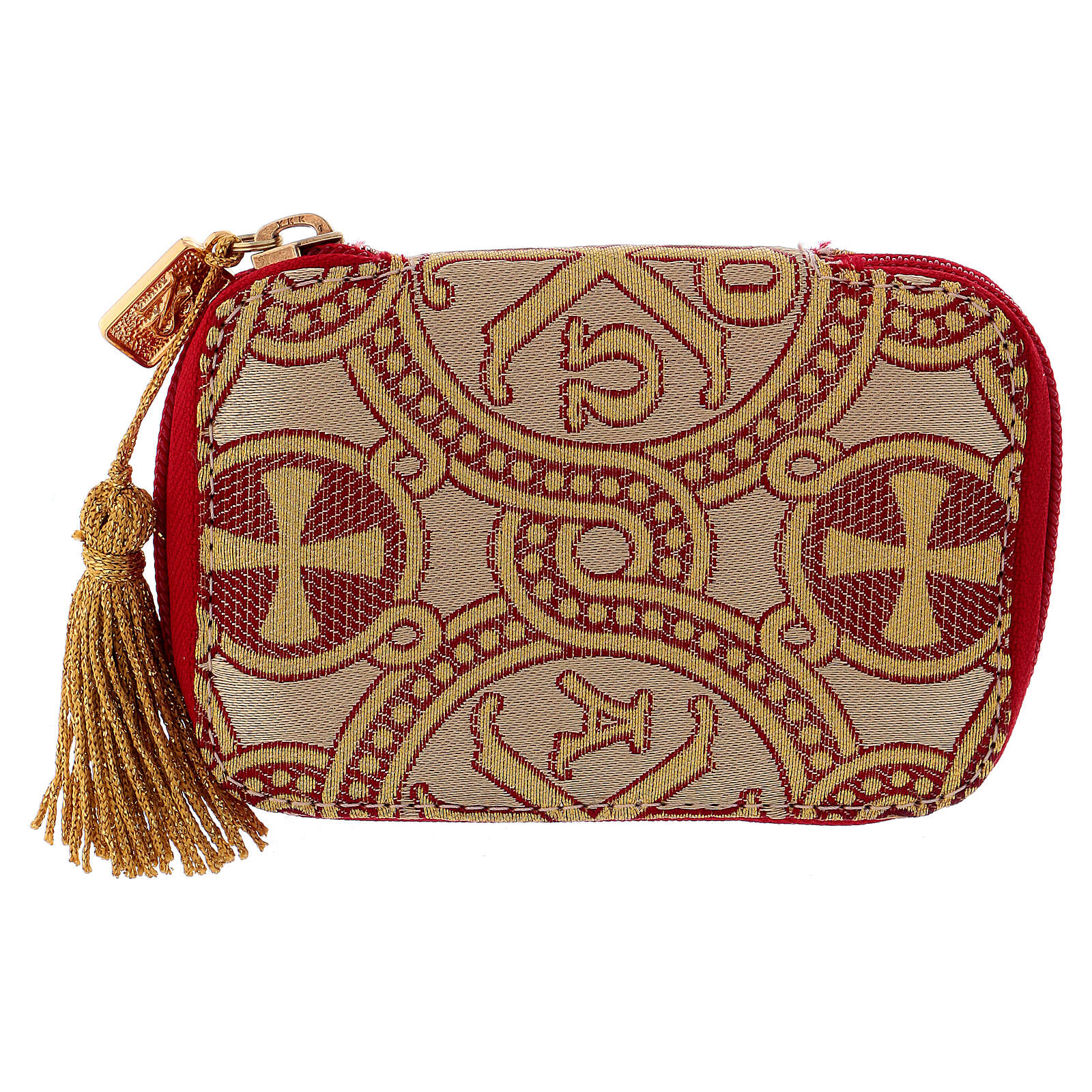 Pyx set with case in brocade fabric, Alpha and Omega decoration