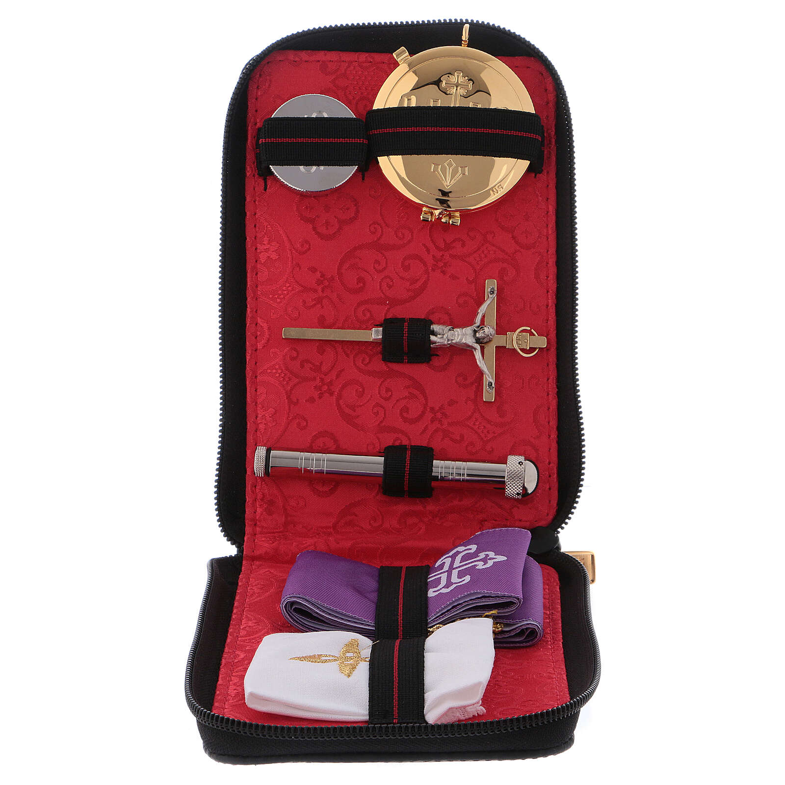 Pyx set with leather case, lined with red jacquard fabric, zipper.