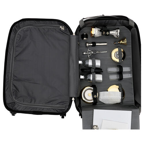 The trolley case contains a complete mass kit with a 24K gold plated brass chalice, a ciborium with lid, a Holy water sprinkler, Holy oil stock, paten, pyx with decorative plate, casted altar with candles and cross' holders, wind-proof glass, cruets of 125 ml, altar bell, pastoral cross, wax candles, bicoloured stole, altar linens with embroidered cross.