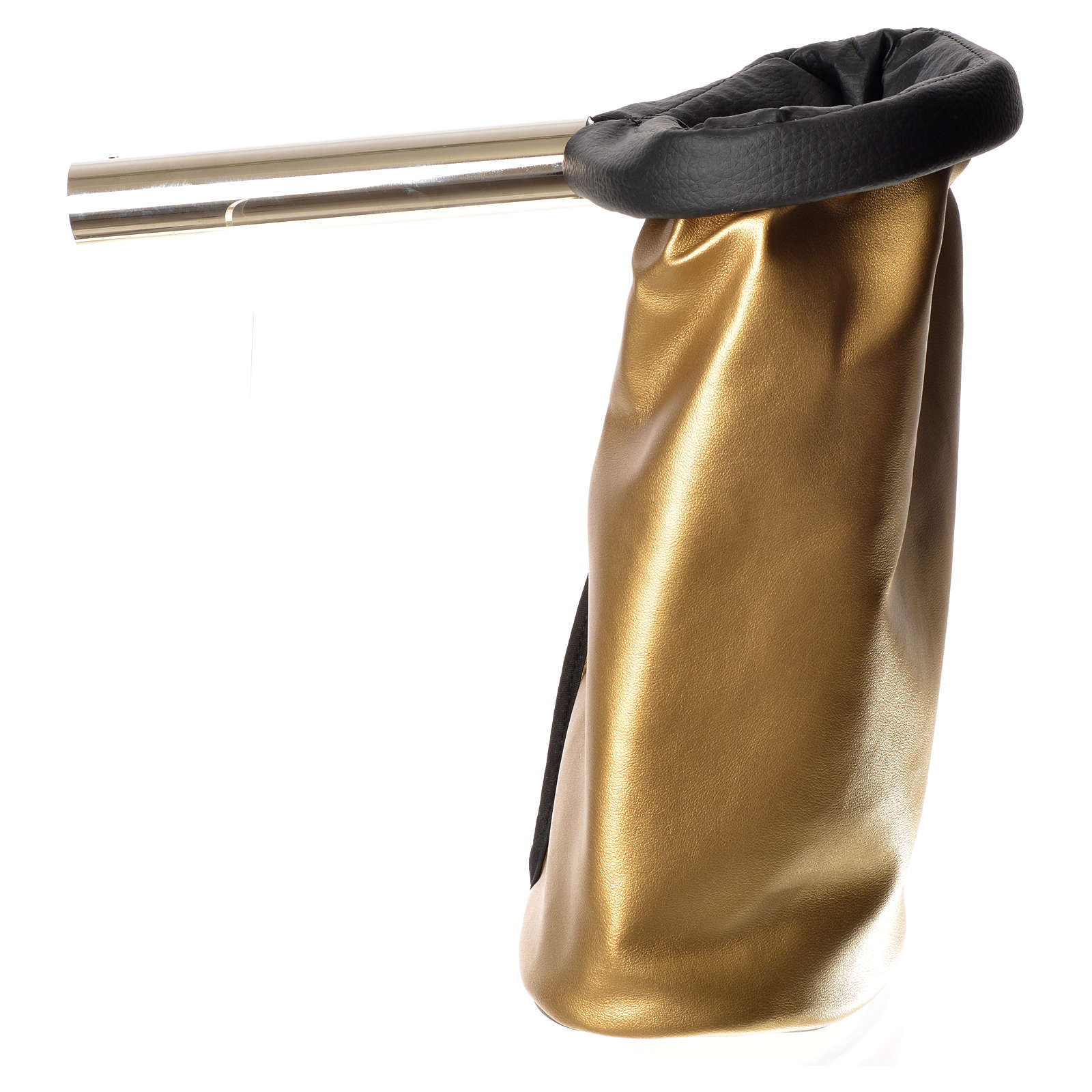 Bag for the collection of alms in artificial leather with handle in wood.