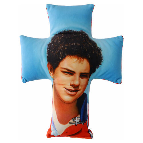 Carlo Acutis cross-shaped pillow, 11.8x9.4 in. This cross-shaped pillow portrays Carlo Acutis in everyday attire, as commonly seen in online photos. Crafted using a sublimation technique on soft velvet and polyester, it ensures high-quality images with enduring details. Known for his spiritual fervor and pioneering use of digital technologies to spread the Gospel, Carlo Acutis remains an inspiration for youth and the faithful. His dedication has left a lasting impact, positioning him as a mode...