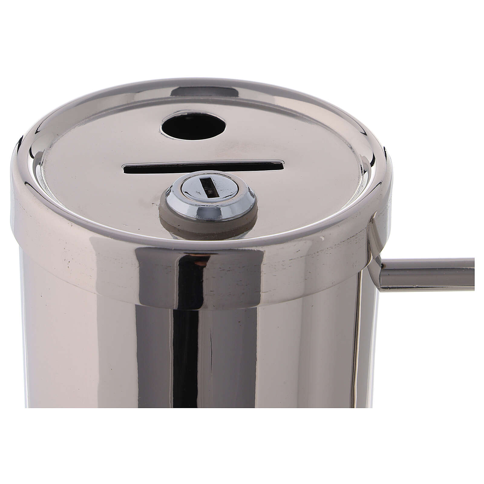 This nickel-plated brass offer box has a practical square handle and holes for paper or coin.