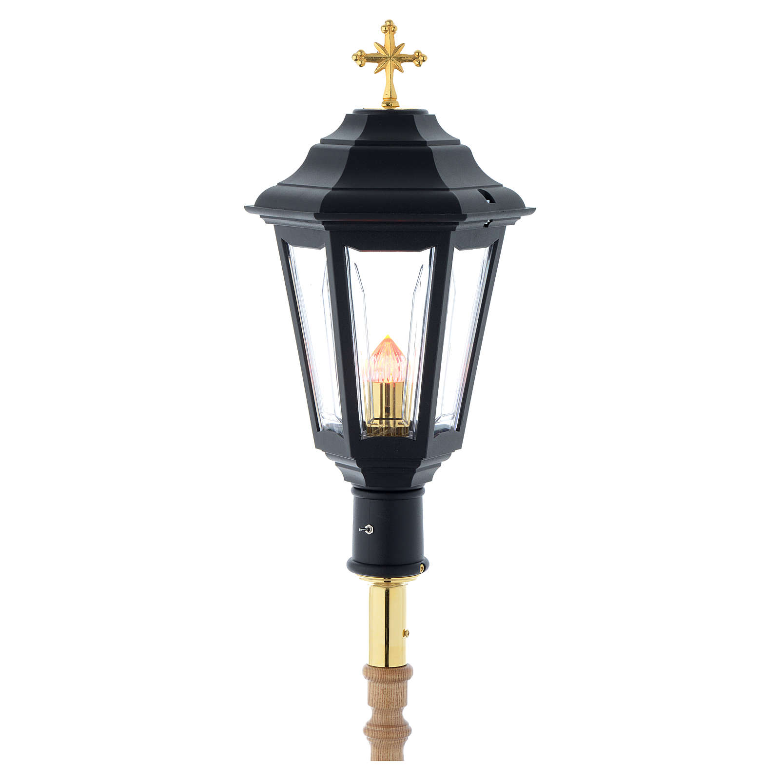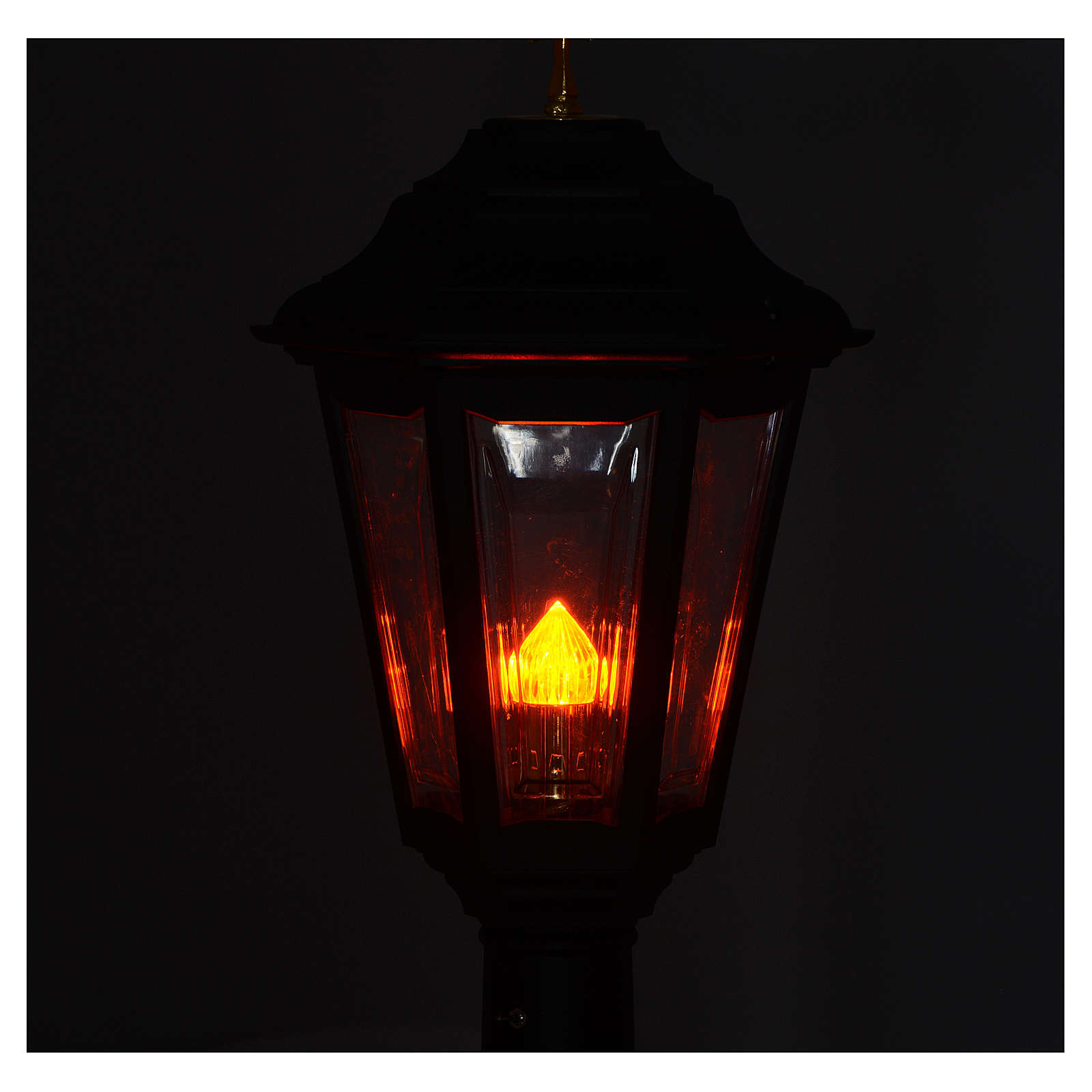 To switch the lamppost on or off there is an external switch. To power it on insert two AA batteries, which are already included.The lamppost measures 50x24 cm and the handle measures 150 cm, for a total of 2 m.
