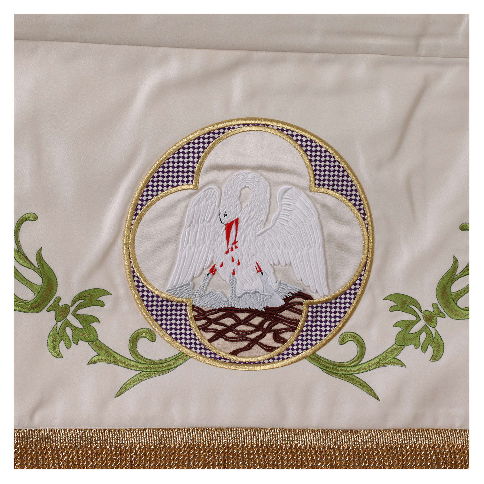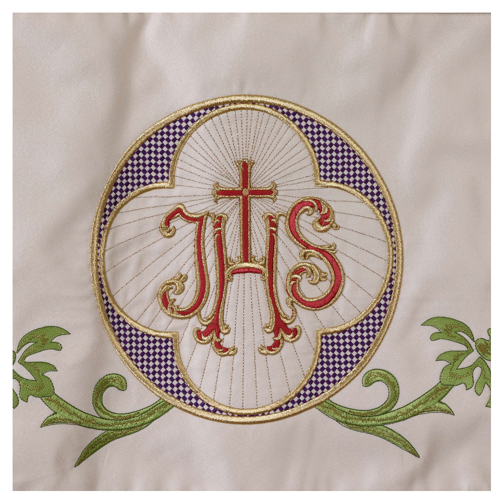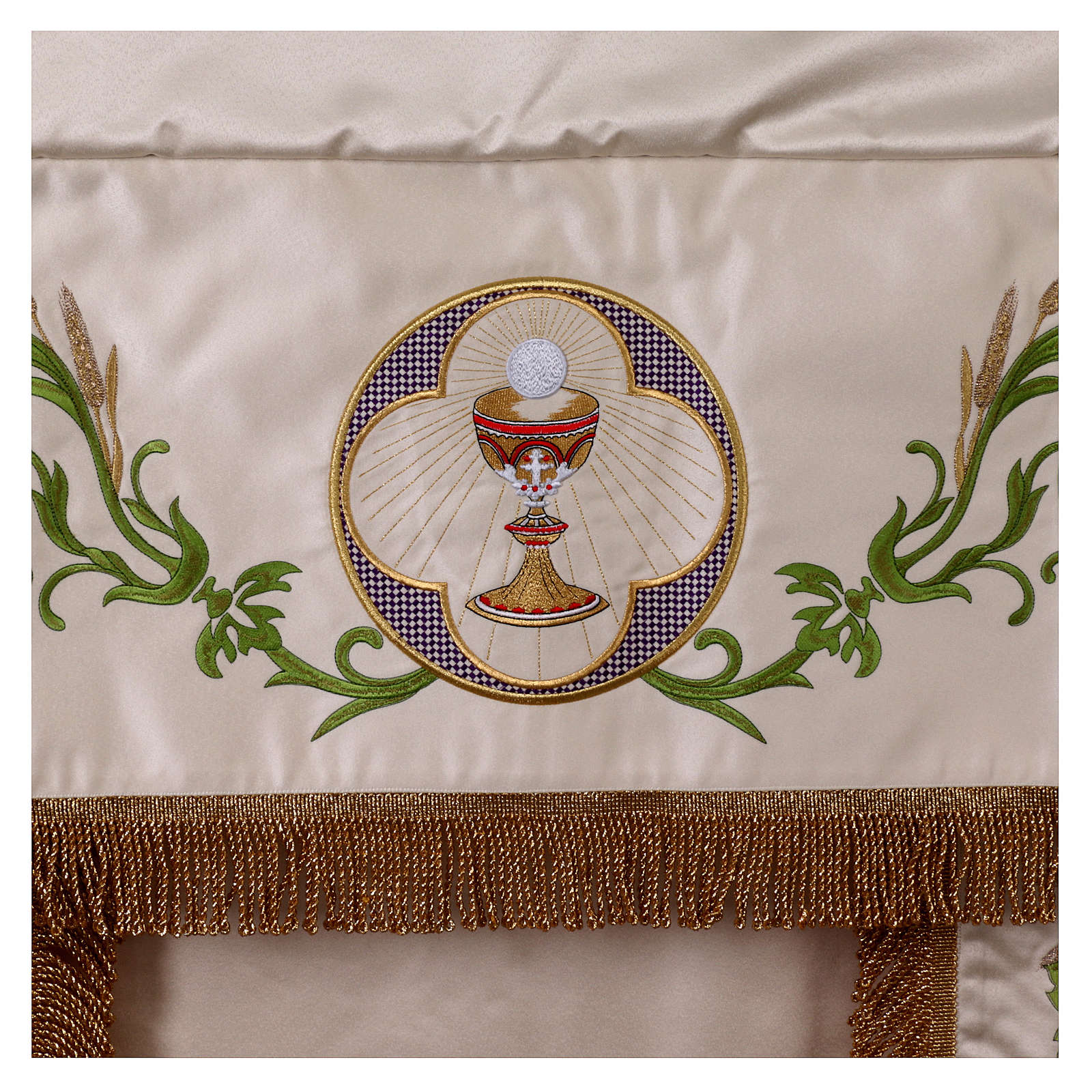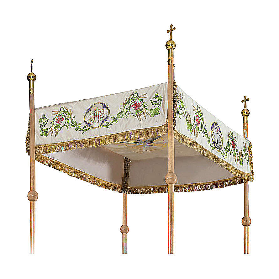 Processional canopy 130x160 with IHS, flowers, and grapes. The fabric is waterproof and tear-resistant. The sides of the processional canopy are decorated with the chalice, the lamb of God, the IHS Christogram, and the pelican which represents the Eucharist. The cover of the canopy is decorated with the dove of the Holy Spirit.