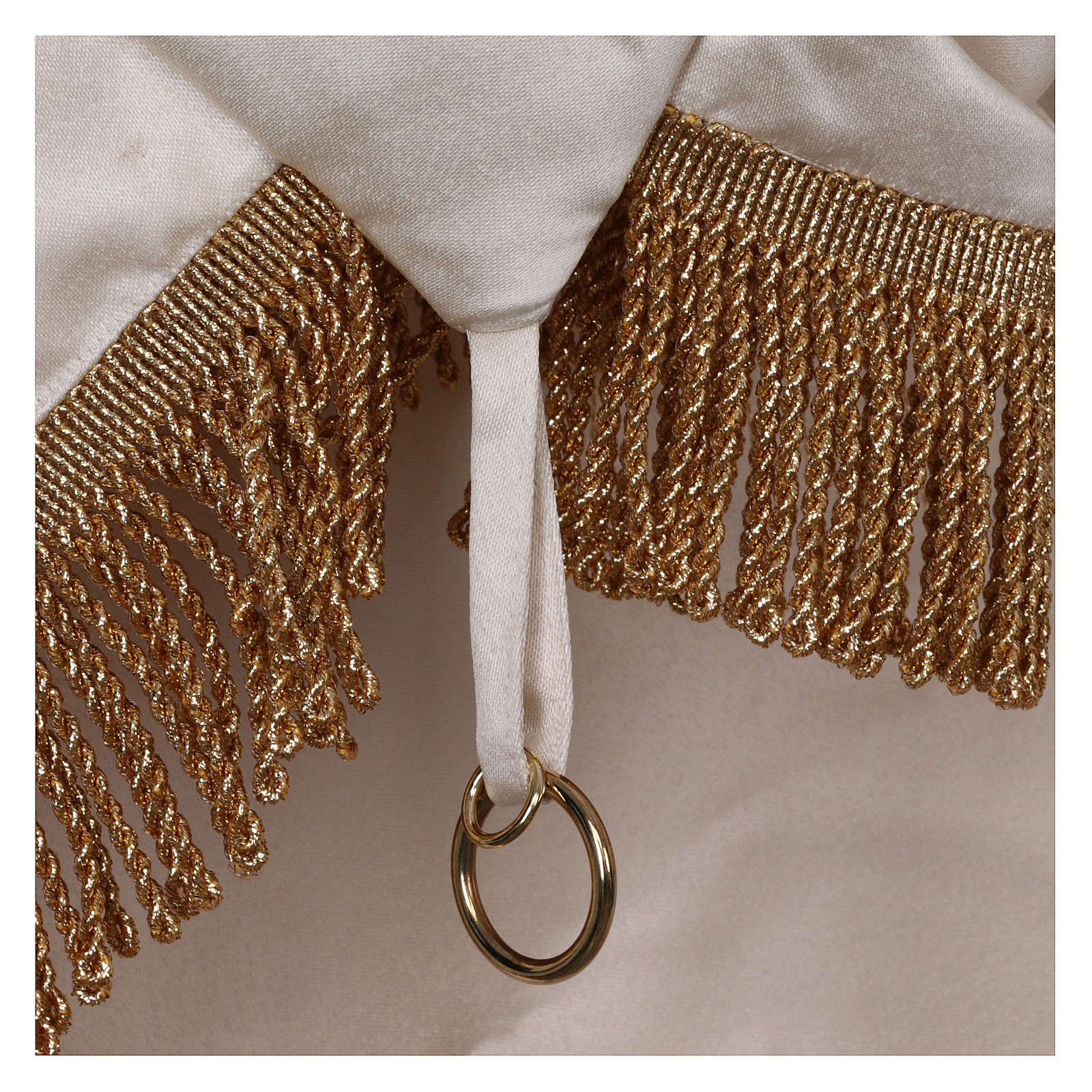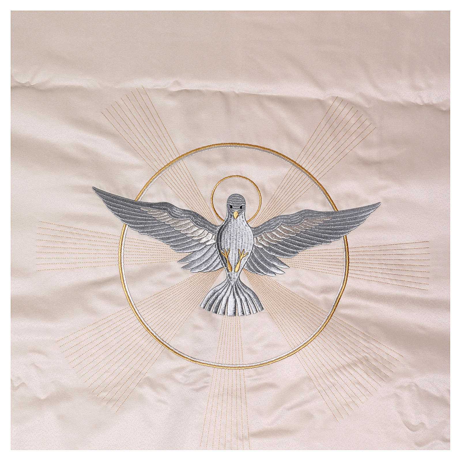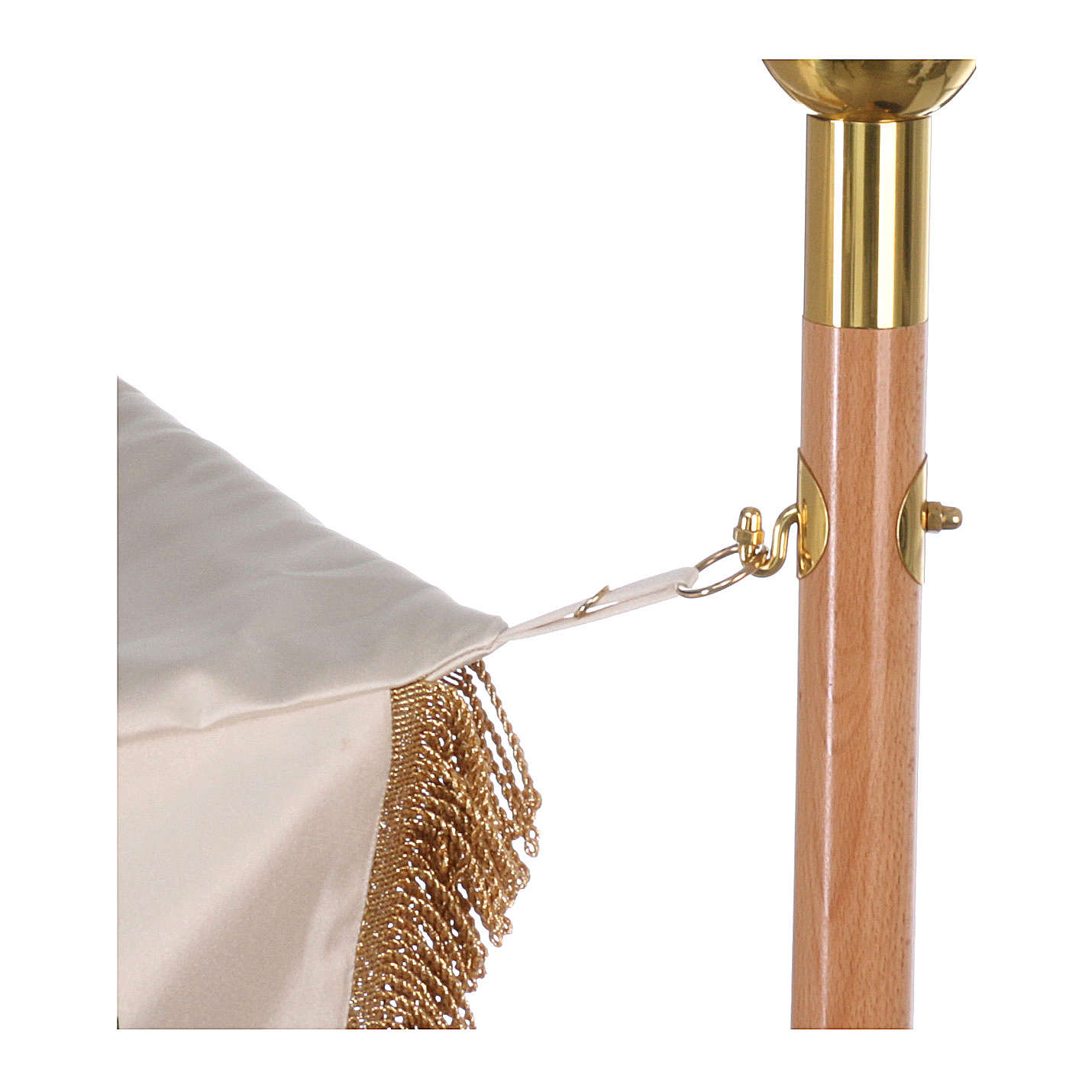 Processional canopy 130x160 with IHS, flowers, and grapes. The fabric is waterproof and tear-resistant. The sides of the processional canopy are decorated with the chalice, the lamb of God, the IHS Christogram, and the pelican which represents the Eucharist. The cover of the canopy is decorated with the dove of the Holy Spirit.