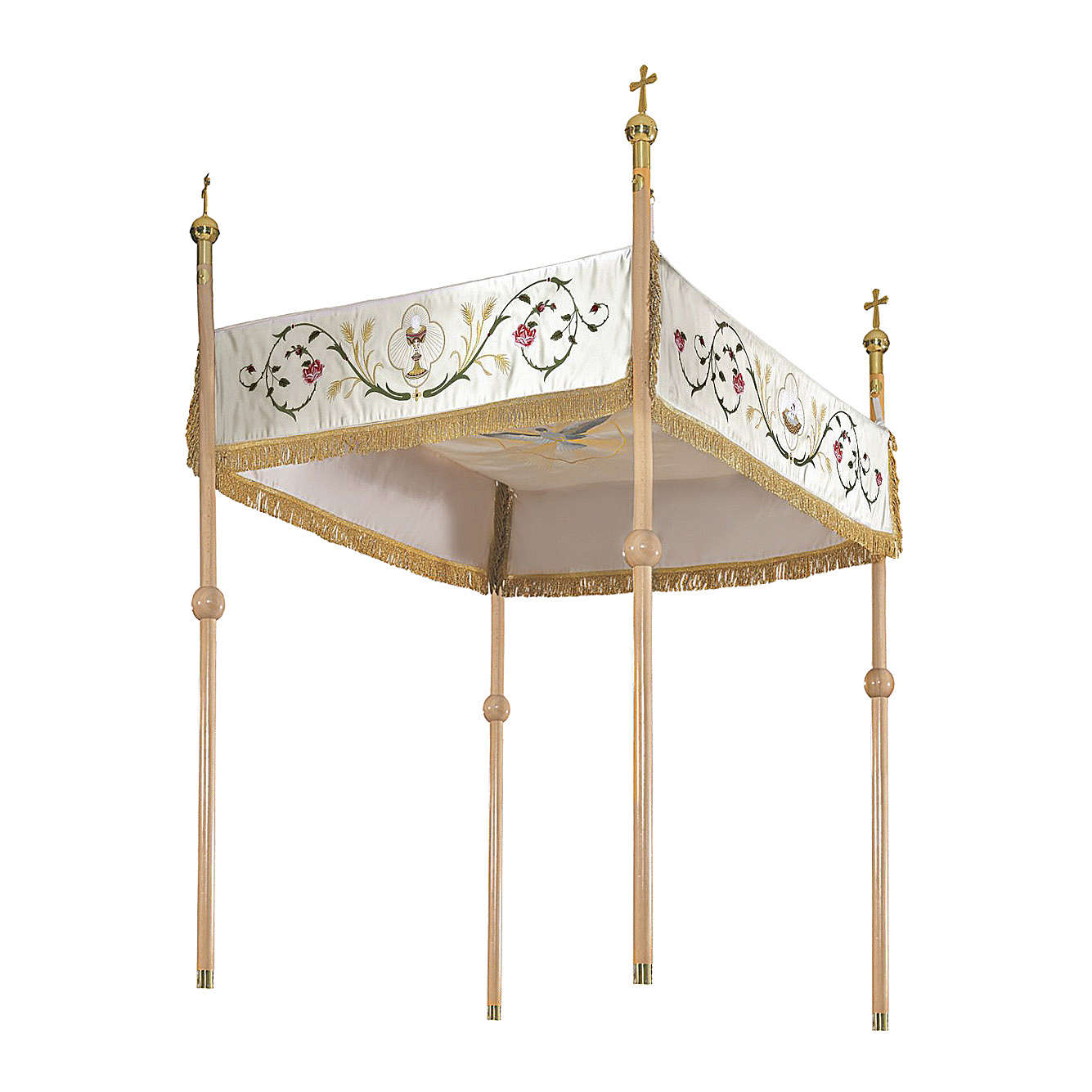 Processional canopy 160x250 in polyester with IHS, flowers and ears of wheat. The fabric is water proof and very resistant to possible tears. The sides of the processional canopy are decorated with the chalice, the lamb of God, IHS Christogram and the pelican which represents the Eucharist. The cover of the canopy is decorated with the dove of the Holy Spirit.