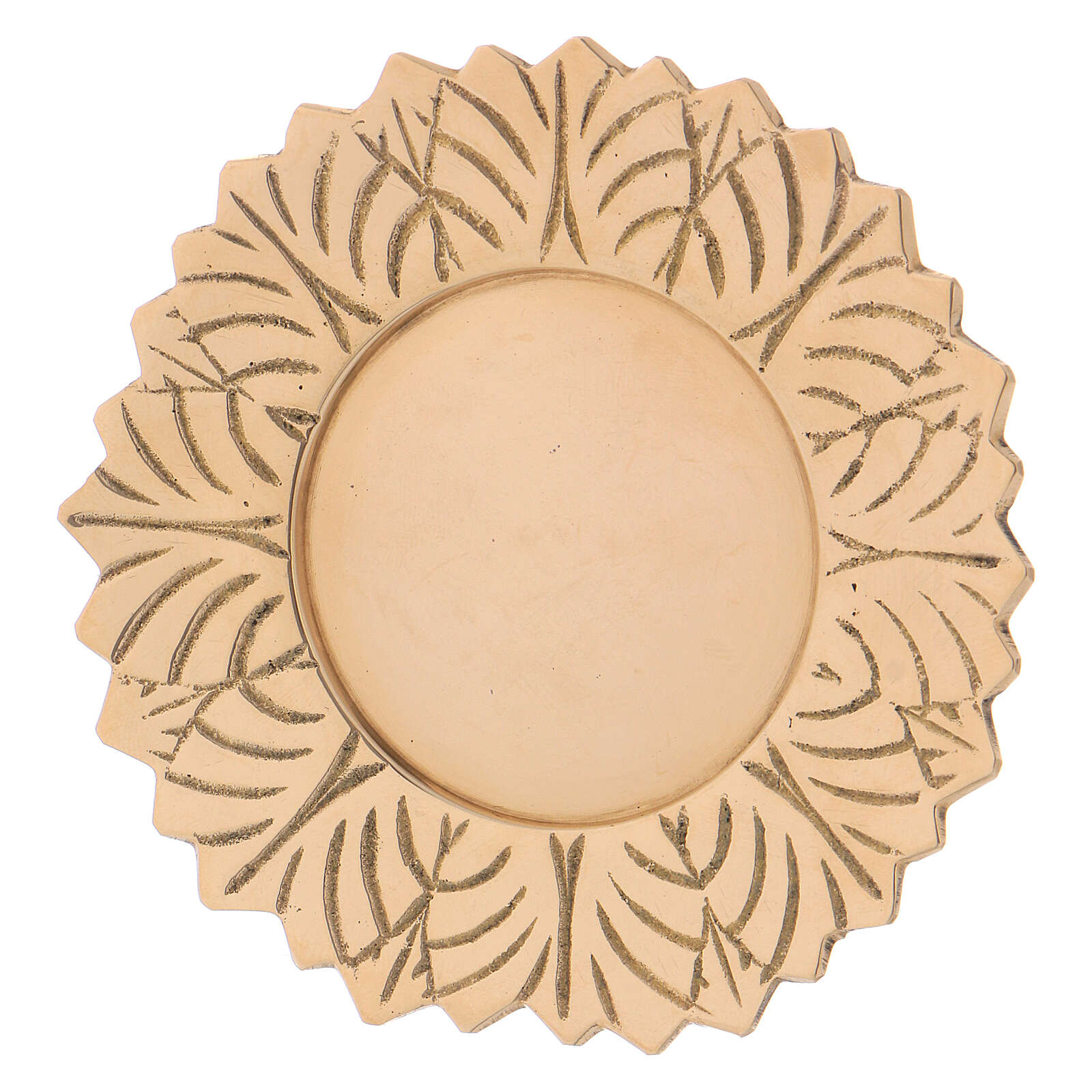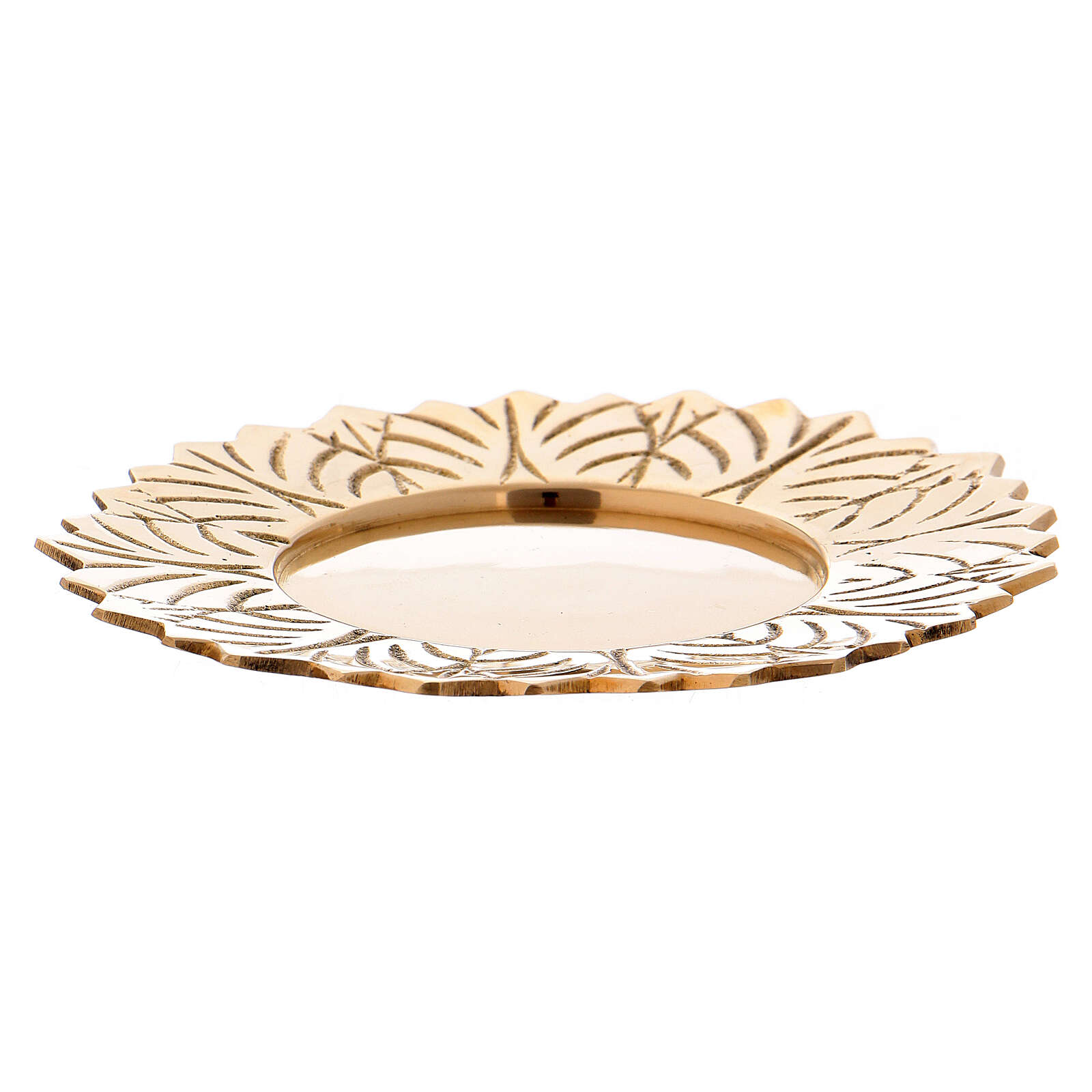 Saucer made of shiny golden brass with leaf-shaped decorations along the edge.