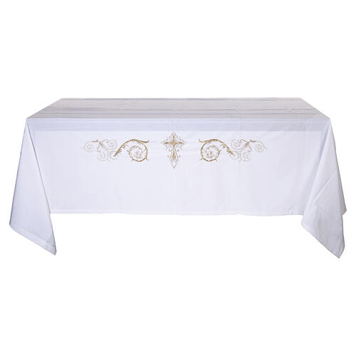 Ivory altar cloth with embroidered eucharistic cross and golden ears of wheat
