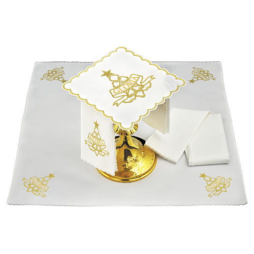 The purificator and hand towel are made of 100% cotton, the pall and corporal are 100% polyester.