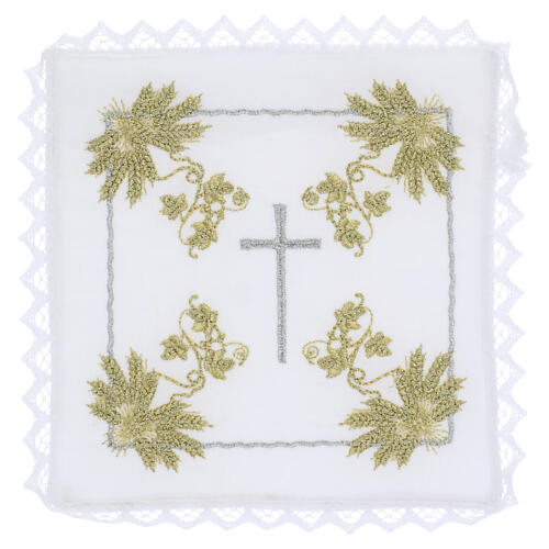 Altar linen set for Mass with golden wheat embroidery and a silver cross.