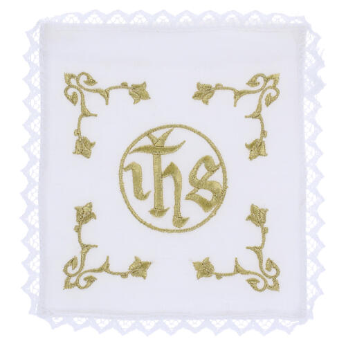 The JHS monogram is sewn at the corners of the corporal and purificator. The pall is finished with lace edging.