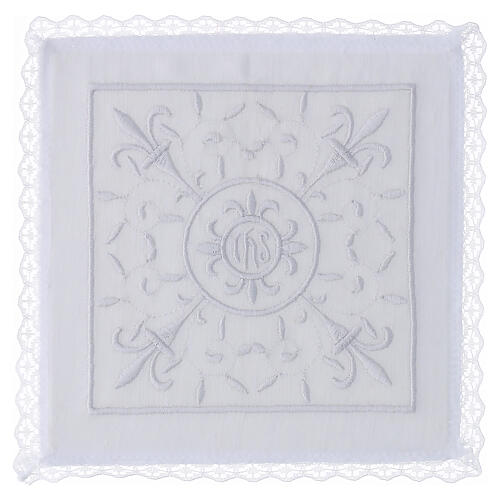 This liturgical set includes the pall, corporal, purificator and hand towel. The floral motif is centered on the pall and echoed on every piece; it also appears on the corners of the corporal. White lace trims all sides.