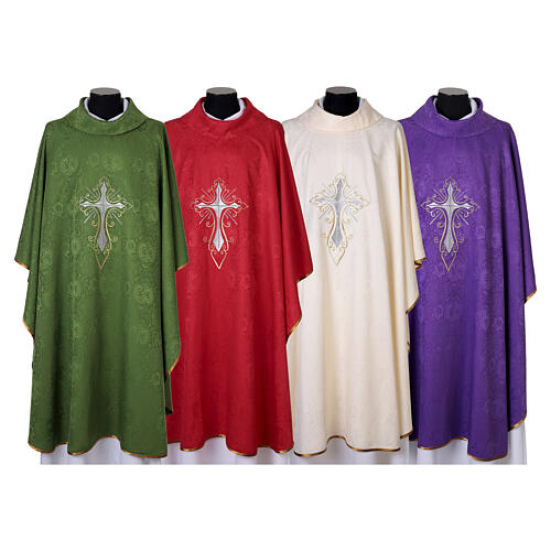Damask chasuble with gold and silver cross embroidery.