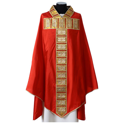 The decorative galloon extends harmoniously from the neckline to the centre of the chasuble.